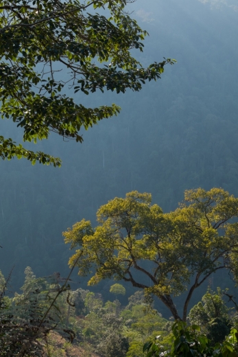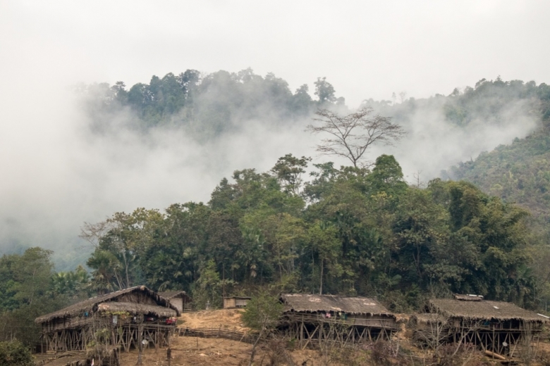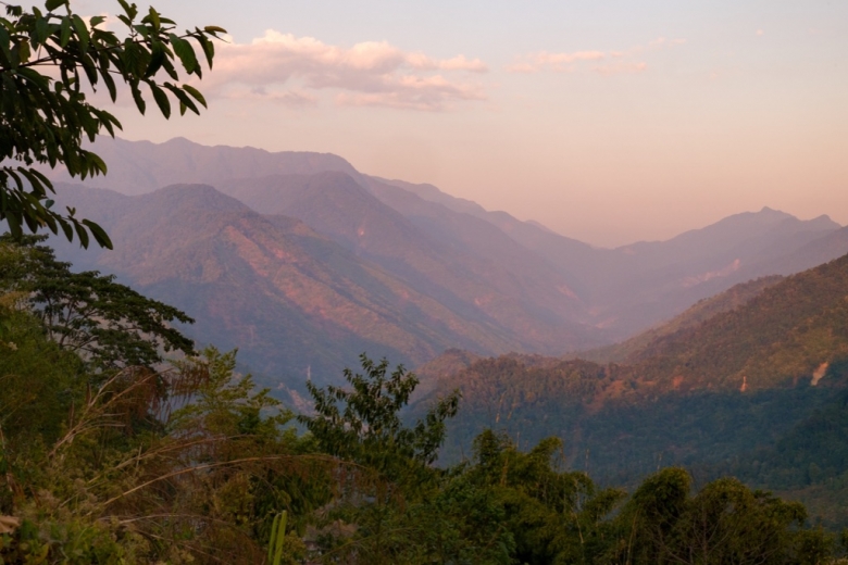 Dunkelblau senkt sich der Abend über die tiefen Täler und grün bewaldeten Hügel. Letztes Licht bricht durch das Geäst um uns, aufgewirbelter Staub eines vorbeifahrenden Autos zeichnet Sonnenstrahlen in die Schatten. Nur noch wenige Minuten, dann wird die Umgebung ihre Konturen an die Nacht verlieren. Eine kurze Dämmerung, typisch für dieses Breitengrad. Höchste Zeit einen Schlafplatz zu finden. Und wie immer kommt er, wenn wir ihn brauchen. Ein paar Bambushütten auf Stelzen und ein längliches Betongebäude mit einer Horde Kinder und ein paar Erwachsenen auf dem trockenen Vorplatz. Eine Schule? Das wäre ideal. Wir rollen auf die Erwachsenen zu, die uns überrascht begrüssen.