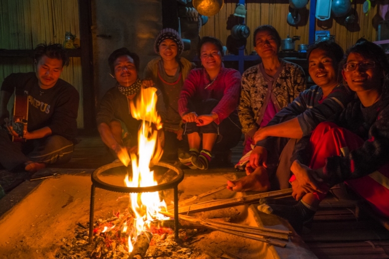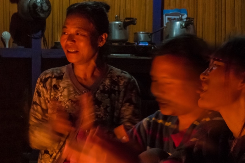Das Feuer prasselt, weckt Geister aus Licht und Schatten an den geflochtenen Wänden der Bambusküche, in der wir sitzen. Wir sind bei der Familie von John Taniang zum Nachtessen eingeladen. Es gibt Reis mit scharfem Bambus Chutney, gekochte Bananenblüten, Wasserspinat und Paneer Curry - ein Festmahl. Diesen Abend, das Lachen um uns, die tanzenden Flammen und das gemütliche Zusammensein an einem so fremden Ort möchten wir festhalten. Sobald wir die Kameras hervorholen, werden auch auf der Gegenseite Handys gezückt. Natürlich, trotz allem, wir sind ja immer noch in Indien. Wir sind Teil einer modernen Welt, Teil des "Mainstreams". Doch noch im selben Atemzug, in dem sich die Zeugen der Gegenwart unter uns gemischt haben, wollen unsere Gastgeber, dass wir ihnen ein typisches Lied von unserem Land vorsingen. Ein traditionelles Lied. Wir brauchen Bedenkzeit. Und in diese Stille hinein beginnt John's Vater selbst zu singen. Eine alte Melodie seines Volkes. Zuerst etwas wackelig und unsicher, begleitet von den befremdeten Blicken seiner Söhne. Dann voller und klarer: Eine Geschichte von einem Schmetterling, der eine duftende Blume findet, sich darauf niederlässt und von der Süsse und der Schönheit dieser Blume in den Bann gezogen wird. Er vergisst dabei, was um ihn geschieht, kümmert sich nicht mehr darum, was vor dem Landen auf der Blüte war und was vielleicht danach sein wird, gibt sich nur noch dem Augenblick hin, der Gegenwart.