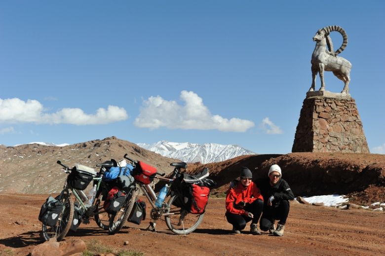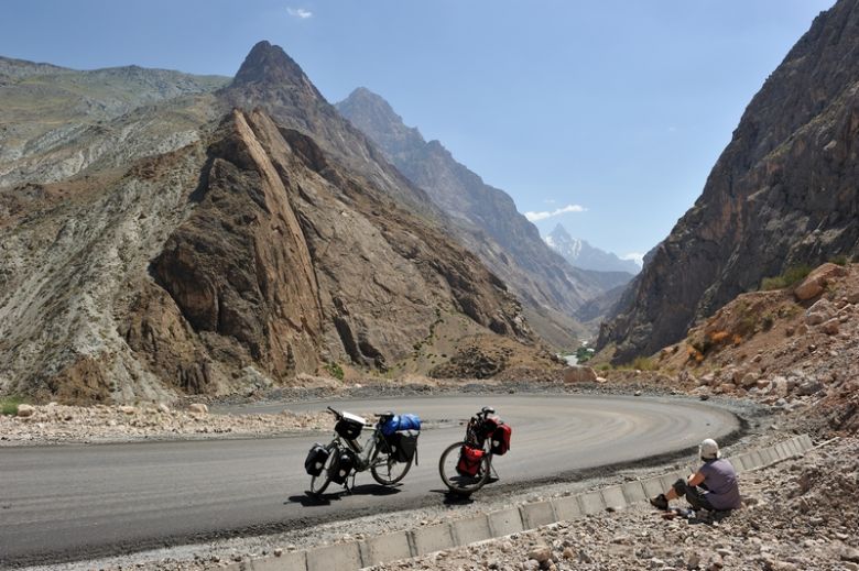 Die Piste schraubt sich hoeher. Fussballgrosse Steine, kristallklare Hoehenluft. Ein Bus singender Chinesen faehrt vor. Die Passagiere klatschen mit weiss behandschuhten Haenden Beifall. «Jesus loves you», meint der Fahrer zum Abschied. Das Echo seines Satzes verpufft in der Weite, verliert sich rasch zwischen den majestaetischen Gipfeln des Pamirs. Auf dem Top holt uns ein amerikanischer Fotograf mit dem Jeep ein. Stellt Fragen, schiesst Bilder. Er arbeitet fuers Adventure Magazine. Tolle Fotos: Rotes Jaeckchen, weisse Berge, blauer Himmel. «Faehrt ihr auch ab und zu off road?», will er wissen. Wir verstehen nicht ganz.