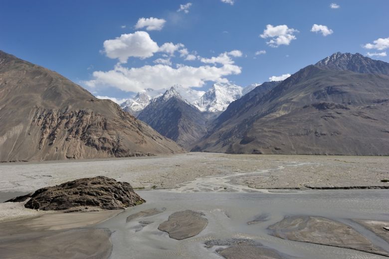 Von Zeit zu Zeit oeffnet sich am anderen Flussufer ein Riss in den schroffen Talflanken. Ein Gletscherbach bahnt sich seinen Weg von den gleissenden Gipfeln hinunter zum Panj, der hier im oberen Teil des Wakhan Tals maeandert. Solche Einschnitte geben die Sicht frei, hinein in den Hindukusch. Gehoert dieser Abhang nun noch zu Tajikistan? Liegen diese Steine auf afghanischem Boden? Reicht das blaeulich schimmernden Schneefeld wohl bis Pakistan? Neugierig spaehen wir in die Seitentaeler jenseits der Grenze, wie ein vorwitziges Kind durch ein Schluesselloch.