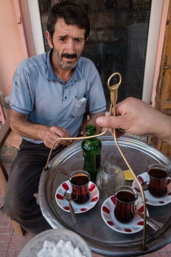 The first Turkish chai we drink at a gas station. It's evening. We asked the gas station attendant if we can stay here. No problem. But first we get tea, strong black tea, slightly bitter, sweet. In Central Anatolia we are accompanied by headwind: it lets waver the yellow burned prairie grass, ruffles trees, shakes the bushes, lets arise small tornadoes in the dusty plains, challenges us gleefully to a duel. It wakes us up in the morning and shakes on the tent poles in the evening, continuous, across Turkey.