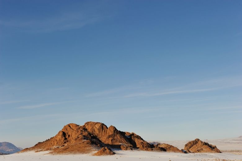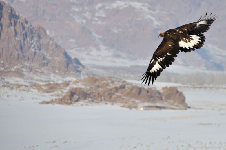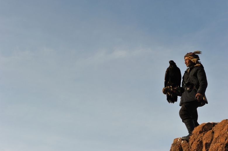 The light in Mongolia is warmer. Maybe it's the winter - the sun is flat, casting golden rays. An endless sunset. Red rocks draw long shadows on the satin matt snow. A man stands against the light, his arm is angled, on that the silhouette of an eagle: Sharp edges, fine feathers. It's Arianit, an eagle hunter. To find him, we rode two hundred kilometers to the northeast of the province of Bayan Olgii. Arianit is Kazakh, the origin of his knowledge in dealing with the eagles is dating back 2000 years. In those days the main reason was the precious fur of the hunted animals. And today? Somehow we had expected a dramatic spectacle. Maybe a bit too touristy, mainly geared for action. Rushing feathers, flying snow, a struggle for life and death. But accompanying Arianit is different.