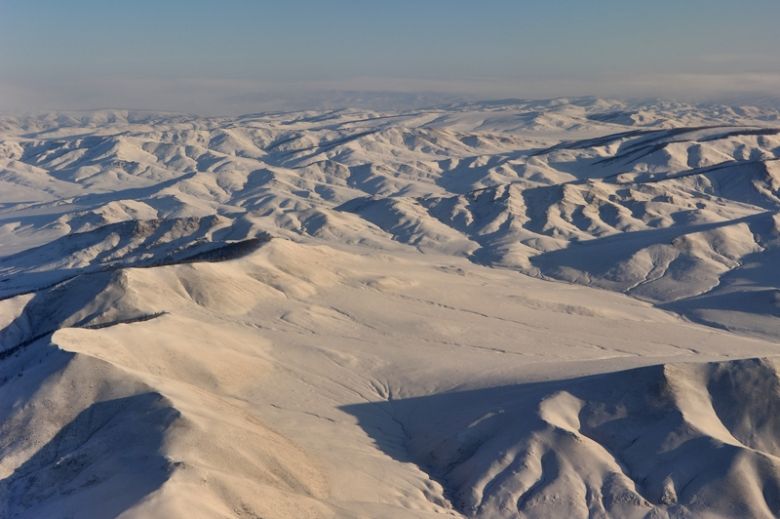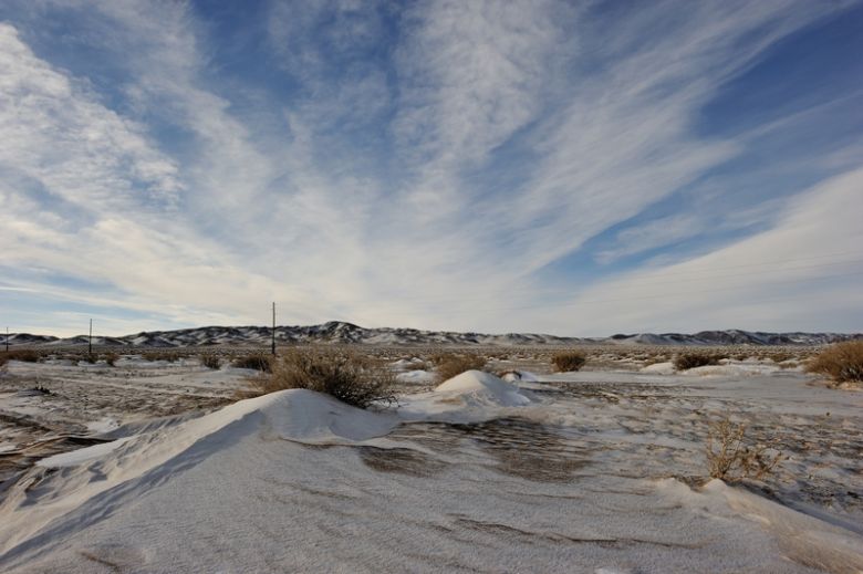 The route which we got recommended by Kanad, has proved to be a little cyclist's gem. Impressive river valleys, mountains and steppe - a pleasure. But now we're on top of this pass, we have pushed the bike the final kilometers and now we see the road converted to a track. The wind has blown the snow to piles, small waves in brown sand. A white sea in front of us, a huge plain. On the horizon flickers a mirage in the cold, fooling hills in front, where it has no more. We sit down, don't know if we'll get this time against the distance. The temperatures have weakened us, we have felt it in the last days. In the morning we've always remained longer in the sleeping bag, the pressure in the evening to find a warm place to overnight, has become bigger and bigger. Perhaps we can't go on any longer, now that even the road becomes worse, when we need instead of two, maybe three days for the next one hundred kilometers. We eat chocolate, hope that the discouragement will pass. A nomad drives his flock to us. Amazing where people live. We give him the rest of the choclate bar. He chews, sucks on the sweetness. To Naranbulag? He nods. We ask him about yurts on the way. Yes, it has. We begin to push.