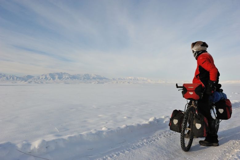 Whenever you ride your bike in a deserted landscape, it happens. The cyclist shrinks, the sky opens. In the beginning waits the uncertainty, the fear of loneliness. It stuffs at the courage, inforces the disorientation. Sometimes it is the lack of water, the wind, a hostile wasteland. Here it's the coldness, wheel tracks, which vanish in the snow. You think immediately of turning back. And then you start cycling. From now on, you achieve everything.