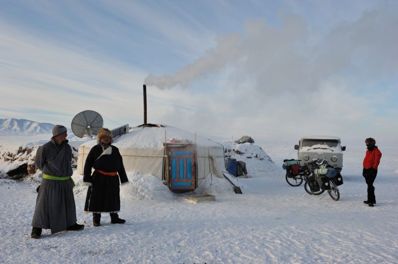 Morning awakening in a yurt. The opening in the roof gets lighter. The man stands up, makes fire. Otherwise, the stove belongs to the woman, but in the morning it's usually the man who light on the fire again. It crackles, yellow light flickers over the framework of the yurt, seeps in the felt, begins to warm. An hour goes by. Then the woman gets up, puts more wood, cooks tea. Salted milk tea. The ice in the pan sizzles, splinters from the heat, melts. There is served cold meat for breakfast. Since long ago we eat everything. Without these fatty pieces of meat we would no longer cycle. It is the third Advent. At Christmas, we will be in Moron. For sure.
