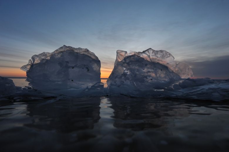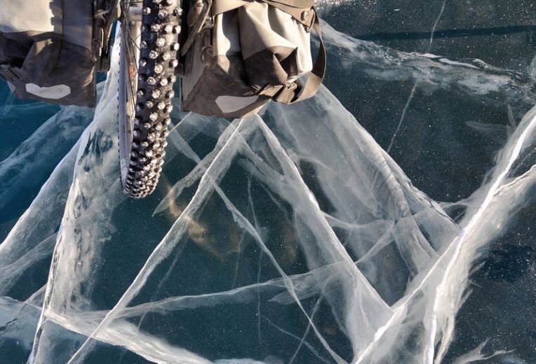 Ice is not silent, it wears the depth in itself, reflects the blue of the sky. Ice lives, it crashes, it rips, roars from the deep. Scary. How can we trust it? We feel as pushed into the void. On the shore you can still see rocks and seaweed on the ground, later only a bottomless depth. I've often tried to imagine how it would be to jump with a parachute from an airplane. The feeling of free fall must be stunning for the first time. I've fear of heights and I'm never jumped. Even now I've fear of heights. The adrenaline flows. Awful amazing. Frozen water has thousand forms, it is never the same: white grooved, wavy milky, shattered by brute force, a mirror finish. Sometimes we have to cross large distortions, press ice, it moans and groans. Then again, we cycle on crystal glass. Also, the color changes, the light.
