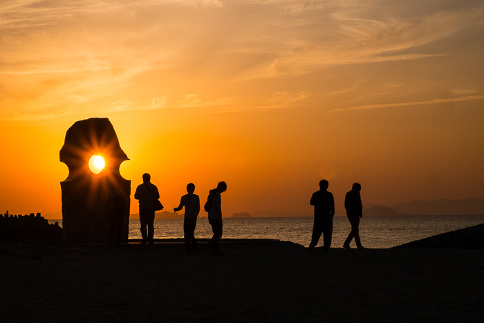 We are camping on the beach beside a road house. Around the corner we bought two microwave menus and now we are looking with a horde of Japanese the sunset. So orange, so tacky. Someone has placed a sculpture with a hole in the upper part at the shore. Eventually, the sun shines through the hole before sinking into the sea. Everyone is waiting for it. Someone plays harmonica. A Japanese cyclist is camping next to us. His name is Hiroshi and he's doing a bike tour over the island. If we like, we can visit him, he says. He lives in Fukuoka. There we will leave Japan in two weeks with the speedboat towards South Korea. We write down his address. When the sun is gone, a rainbow lamp begins to shine onto the sculpture. Some teenagers are jumping in front of it and snap pictures with their smartphones.
