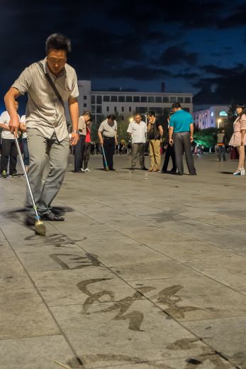 Searing spotlight in front of a plum-colored evening sky. The large square in the center of Ulan Hot gets alive. Dancing, everybody can join, everyone can participate. Group dances, fixed steps, evening after evening, repeated thousands of times. Older couples waltzing, between a single man, with large movements, dreamy, a lonely Doug from Strictly Ballroom. Chinese Mongols play electric horsehair fiddles, street painters draw with foam brushes and water characters on the bottom plates. Transitory and beautiful. They bring good luck. We love the place. A light-tipped propeller buzzes in the sky. It flashes in all colors.