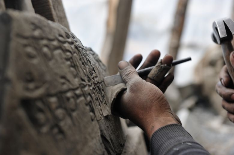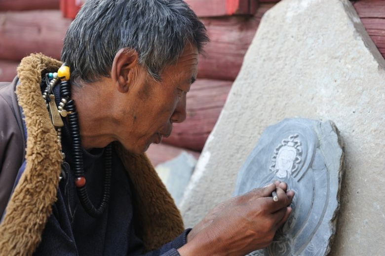 It's the perfect place for the Tibetan stone carvers. We meet them randomly, just after the Chorten. Actually we only wanted to shop in the small store and then hide to camp in the bushes in a few miles. But the intricately crafted stone tablet next to the store window grabs inevitably the eye. Fine lettering, mantra verses and a Buddha. Who can carve such a delicate image in the brittle shale? The shop owner has noticed our glimpse. He comes out of the house, pointing to the stone tablet and then at himself. We should follow him. Undoubtedly, he is the master who created the artwork. He takes us behind the house. Here are lots of unfinished stone tablets, and a bit further back others are still working on the thick gray plates. "Mani" stones are produced here. At special places they are set up, piled into meter-long walls. In the Himalayas not only the people pray but also the stones. They help the Tibetans to spread good thoughts and wishes. We are led around, look, marvel. In the end, we drink butter tea and eat roasted barley flour in one of the simple huts. Tsampa, the staple food of Tibetans. On the wall hangs a portrait of the Dalai Lama.