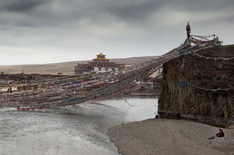Jachi. Something is wrong with the place. The monks have told us. Also in Jachi there would be a monastery. But only women would live there. We laughed. When we arrive in the village, also we have the feeling that there's something strange. Tents and huts everywhere. All the hills are full of it. No fixed home and thousands of people. Almost all are women. Dressed in red. Pilgrims and nuns from all over Eastern Tibet. Bhikkuni, followers of the Buddhist's woman order. Bhikkuni has existed since the citation of Buddhism. However, the women have always been subject to discrimination because of eight rules that the Buddha had imposed to them. Until the twentieth century, the women's order in Tibet was rarely practiced. But the 14th Dalai Lama attempts to strengthen Buddhist nuns in Tibet. And we've found such a nunnery by coincidence. We stay for a day exploring the narrow streets. Countless meditation cabins are scattered in the plain and over the hills. Prayer flags flutter in the wind, decorate bridges and river banks. We observe all the people: Old women with weathered faces, young nuns and children, a rocking motorcyclist, long hair, leather jacket, sunglasses. They all walk the Kora, the sacred path around the monastery. In the Himalayas not only stones, but also steps do pray. Each circumnavigation strengthens the good wishes, the prayer. The motorcyclist holds through the longest. He's still runing even when we come back hours later from our tea invitation. Tirelessly. For how long? We walk a round with him, smile at each other.