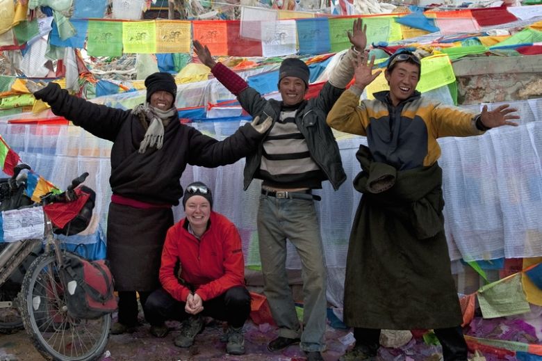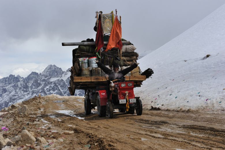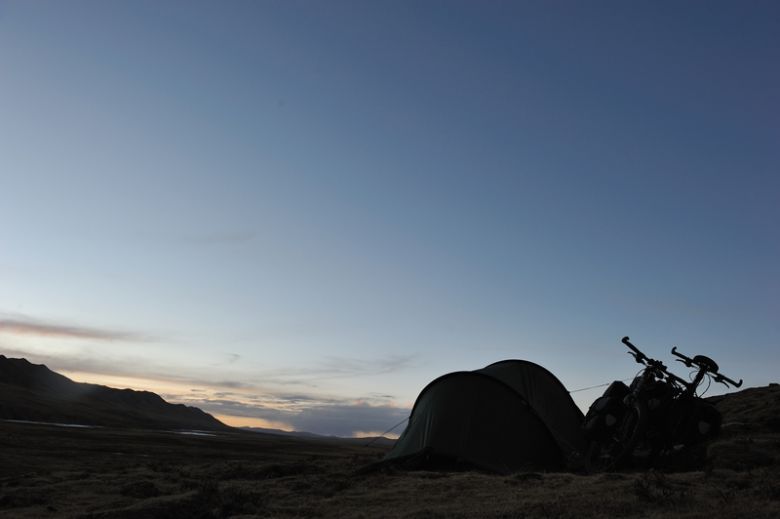The way to the Tro La is dusty. The asphalt has long ago ceased and still the road winds up to the sky, through the craggy peaks of the Chola Mountains. The landscape has become wild, the air thin. 4900 meters, the highest pass of our trip. We cycle on the road that leads to Lhasa. They are not the first pilgrims, we encounter, but the two we'll never forget. Tired they've come towards us, a tied leather apron, corded wooden boards on the hands. Walking two steps, a prostration. On their knees, in the dust. The forehead touches the ground, arms outstretched. Standing up, walking another two steps. 1000 kilometers remaining to Lhasa, meter by meter, pass by pass. Days, weeks, months. We get off the bikes, share our last cookies, try to understand. The two exercise themselves in modesty and humility on their pilgrimage. What willpower you need for such a path, which feeling one feels when he finally achieved his destination after this incredible effort? The knowledge of one's own resilience, the confidence in body and spirit must be enormous.