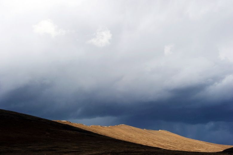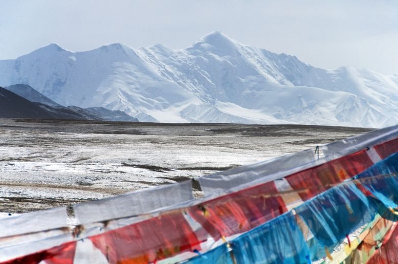 When leaving the province the landscape changes. We are riding continuously over 4000 meters. A vast plateau under the spell of the play of light, the land of the Golok nomads. Here rises the Amnye Machen, the sacred mountain of Eastern Tibet, the seat of the mighty God Machen Pomra. His bottomless crystal palace reach the center of the earth and its towers touch the moon and stars. Rock and ice are under his command, and the white horse Droshur carries him in no time to all parts of the world. The mountain is the end of our journey through Tibet. A little later we leave the plateau. From one day to the other, we enter the desert. First sand dunes, the edge of the Taklamakan is reached.