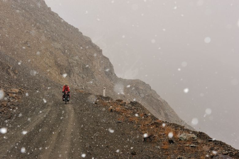 The first Probusk control takes place in the middle of the road. A rusty truck stops, a Military jumps eagerly out. It begins to dawn already. Fortunately, we've obtained information in advance about the exact checkpoints. A bribe story, as we have seen during the Pamir trekking, we want to avoid if possible. We agree: The guy gets here neither our passports nor our documents. The border zone is still far away. The military man borders around, slavers on our map, wags his red ID, finally leaves with his stinking monster.