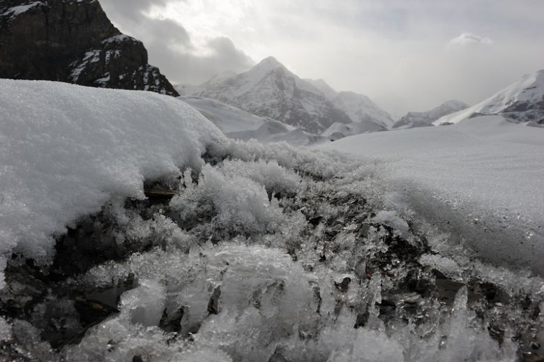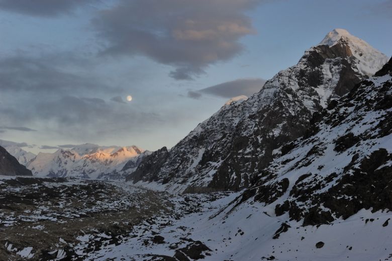 Inylchek, the world congeals. Snow and ice, rock and sky. A landscape from prehistoric times. Thundering rock avalanches, dusting ice falls, sky-high mountains. We reach the Merzbacher Lake after three exhausting days of walking along the right moraine. It is empty. Every August breaks the accumulated water the dam and floods the whole valley. Now the place is a wall of ice. A silver full moon rises over the Merzbacher Camp, the glacier bangs in the cold.