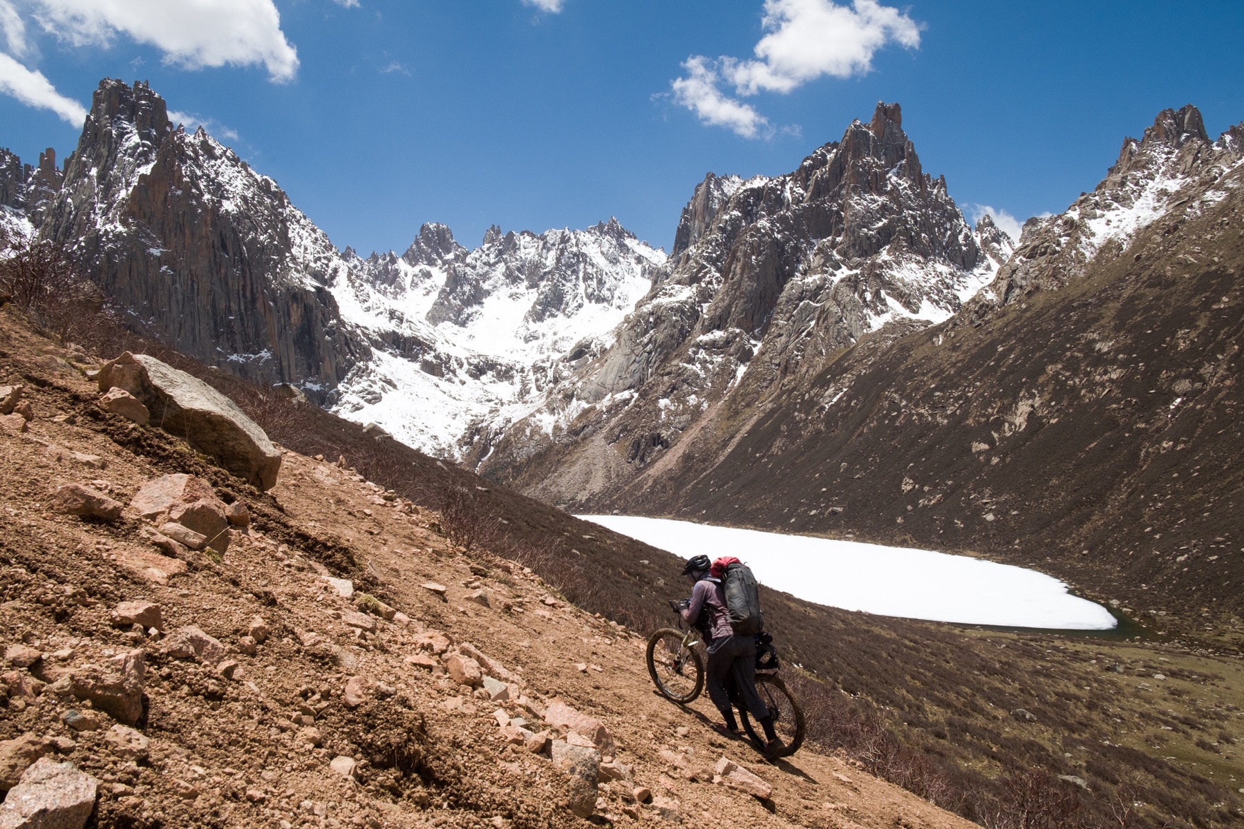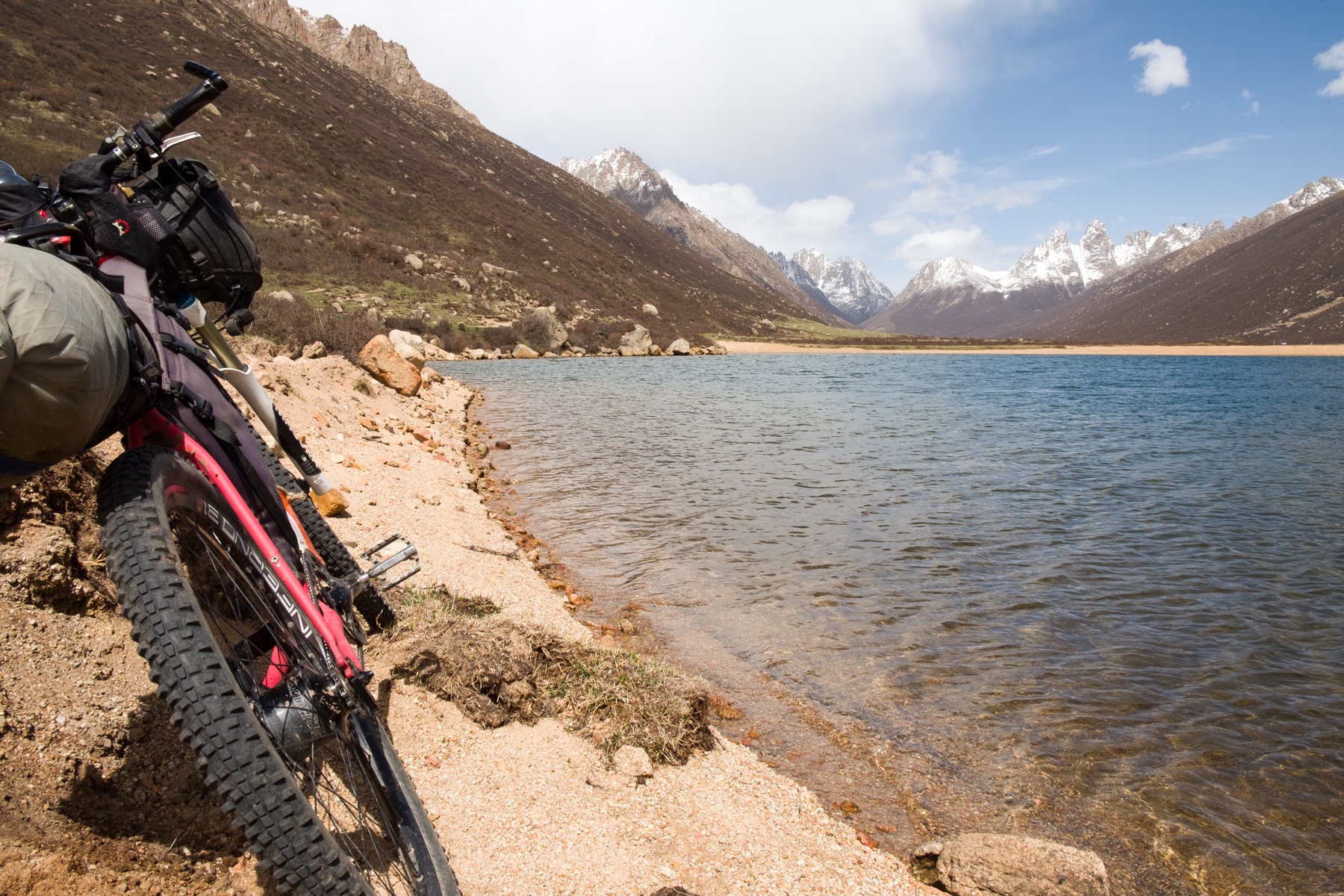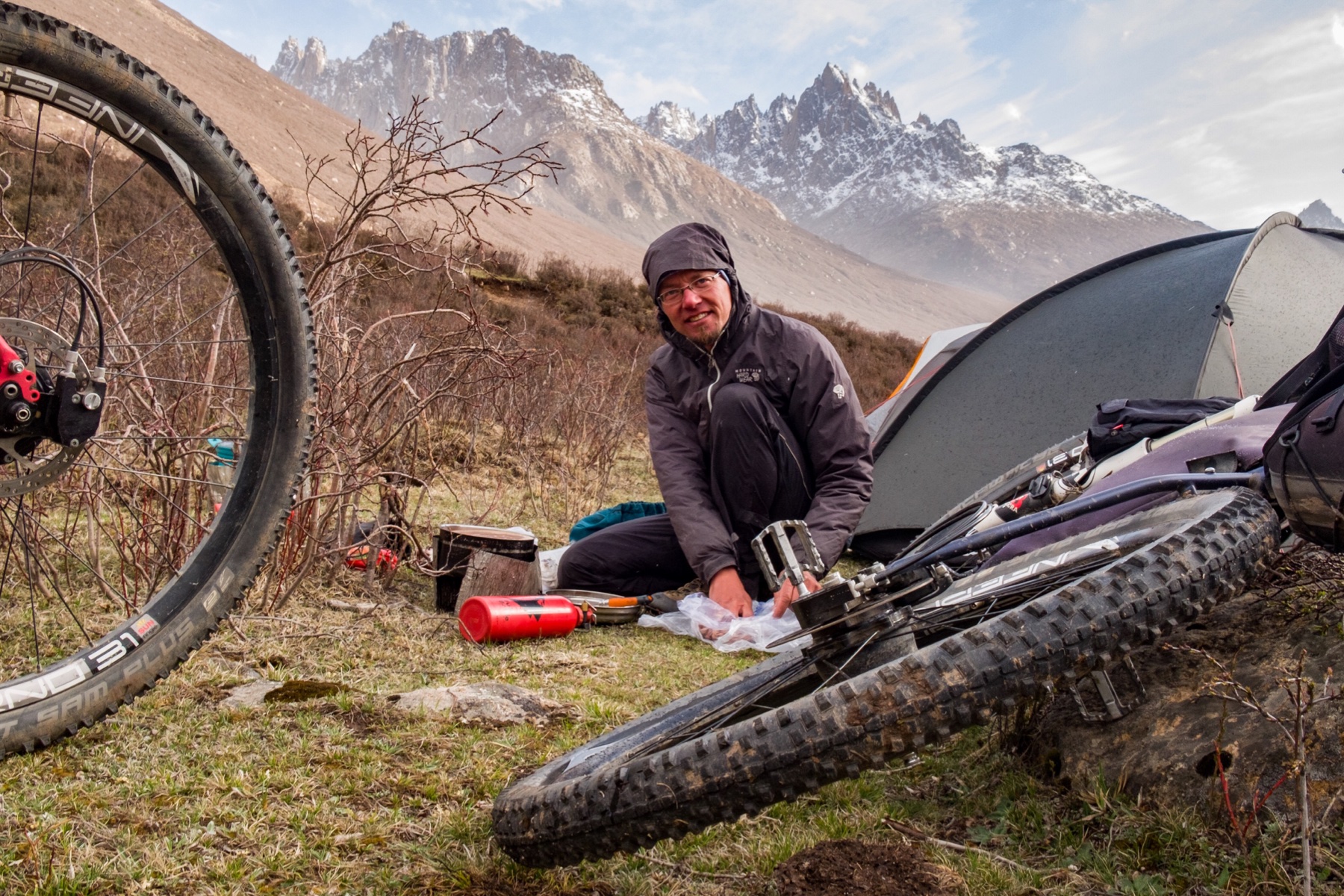 After Bayju we reach the granit massif of Nyempo Jurtse. On satellite images and old sovjetic maps we have found a trace, which should lead us right through the centre of this mountain range. The weather forecast reports a three-day good weather window, and after the hilly plateau landscape of the last few weeks we are longing for some more dramatic mountains. A narrow concrete road becomes gravel and then a perfect singletrail along a mountain lake. Rugged peaks tear the fast passing clouds into pieces. In the evening we set up camp at the bottom of the valley. A short snowstorm, then sparkling stars.