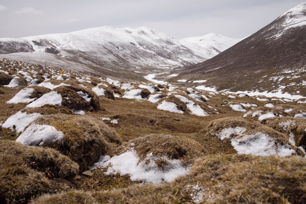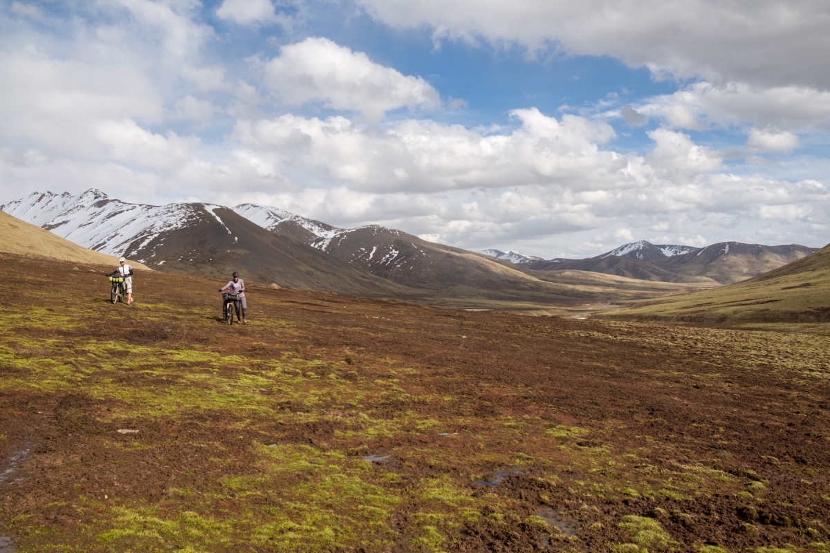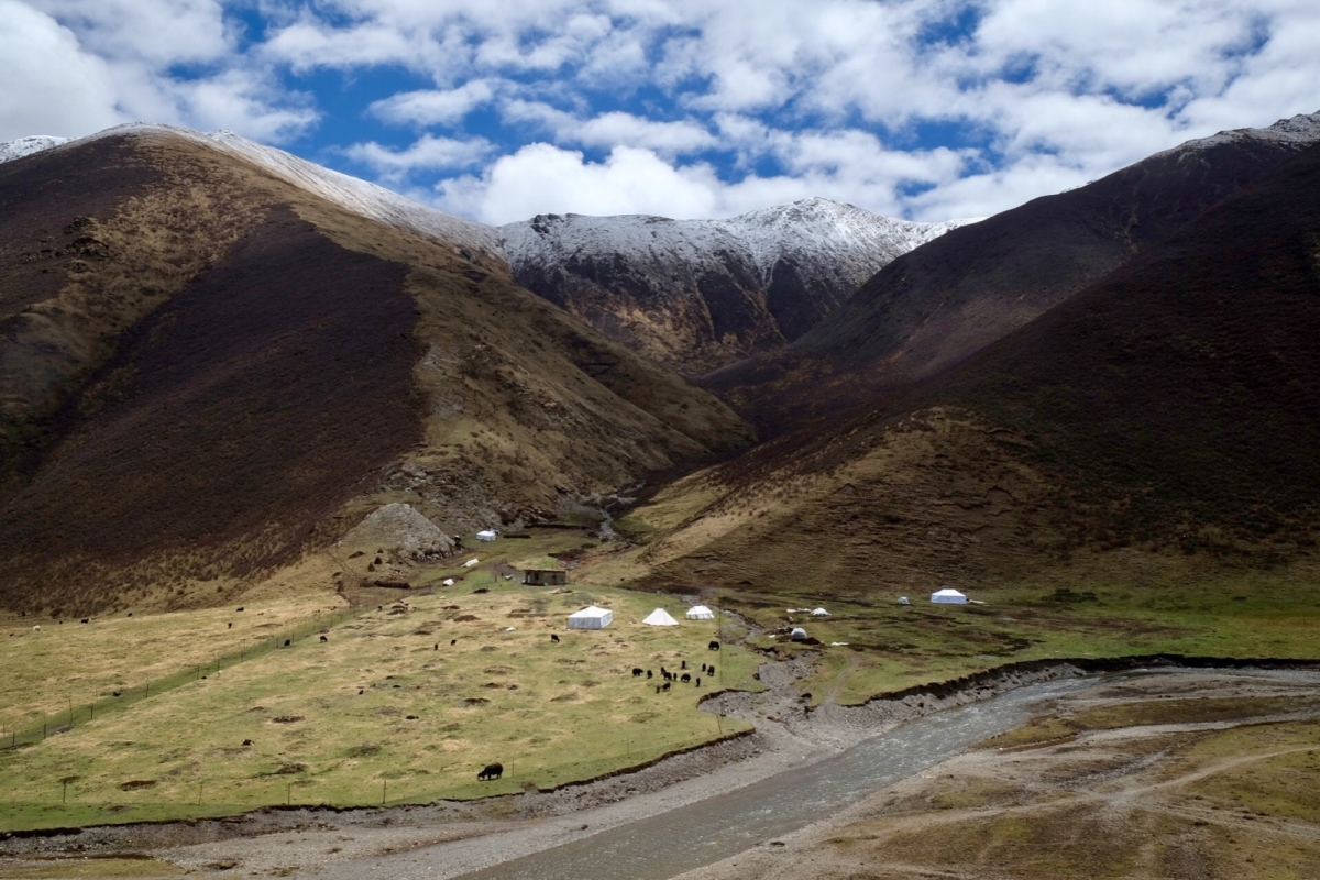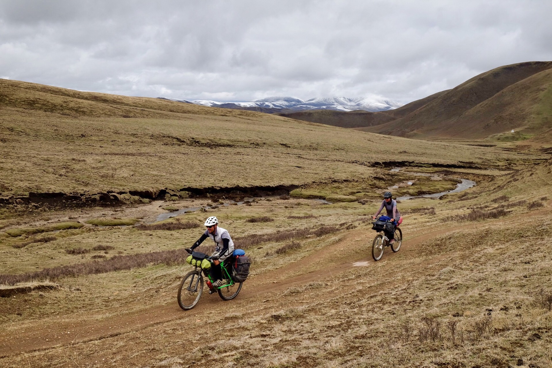 After Bayju we reach the granit massif of Nyempo Jurtse. On satellite images and old sovjetic maps we have found a trace, which should lead us right through the centre of this mountain range. The weather forecast reports a three-day good weather window, and after the hilly plateau landscape of the last few weeks we are longing for some more dramatic mountains. A narrow concrete road becomes gravel and then a perfect singletrail along a mountain lake. Rugged peaks tear the fast passing clouds into pieces. In the evening we set up camp at the bottom of the valley. A short snowstorm, then sparkling stars.