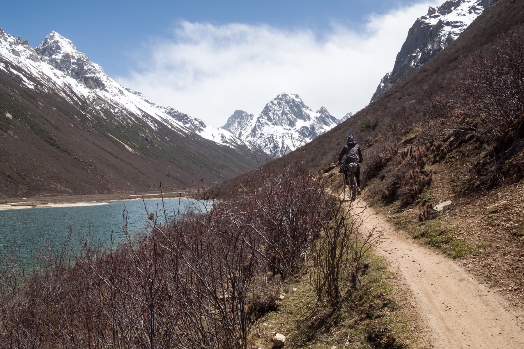After the singletrail follows the hiking path. 300 meters of altitude gain from our base camp up to 4500 meters. We remove the backpack from our front harness and load all luggage on the back. Even with an unloaded bike, the hike-a-bike section up to the pass is exhausting. But we do not want to be anywhere else. The mountain lake below us shrinks, the rock faces and peaks move closer. Exactly for such stretches our heart beats. We love to have our heads in the clouds. Even though we sometimes get a blue nose. We know that it is almost always worthwhile to keep going when the path ends.