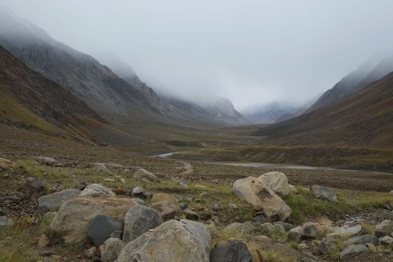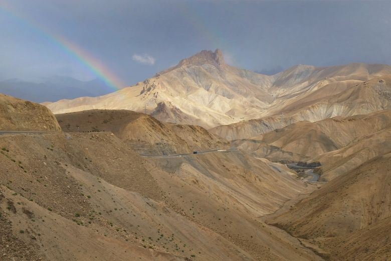 The route to Kargil is perfect for training and acclimatization. A narrow tar ribbon runs along the Indus river and climbs a few passes over 4000m, when the valley bottom occasionally get too tight for it. The clouds are hanging low, covering the highest peaks with a black veil. The Monsoon brings rain. Big, cold drops clap on our sun glasses, the prayer flags are hanging limp and wet at the high point of Futu La. But then, unexpectedly the thick cloud cover rips. Warm sunlight fights against the dark, gray, washed-out world and paints lonely islands of light in the monotonous gray. A rainbow in the sky, bright clouds of steam rising from the ground - dramatically, just as the Himalayas must be. We grin: "Blue sky just would be boring."