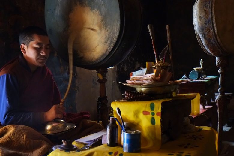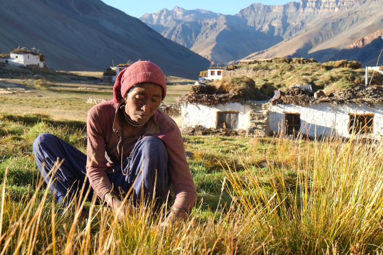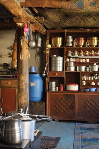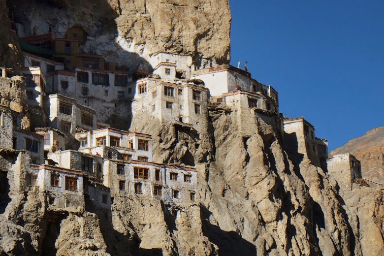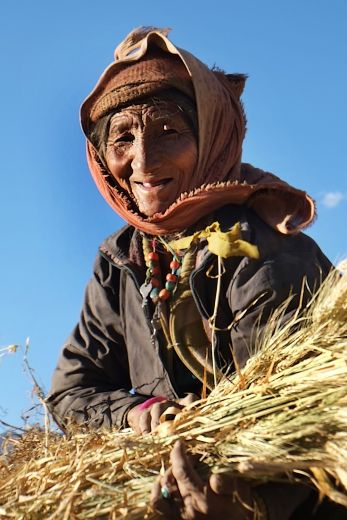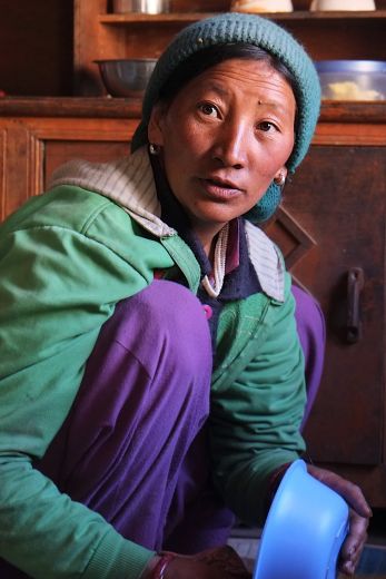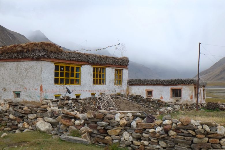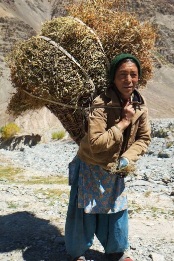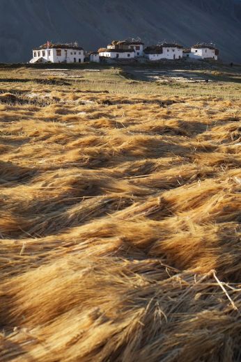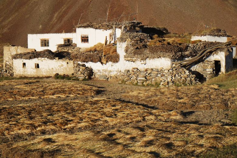 But our efforts are well rewarded. In the upper Zanskar valley time seems to have stood still. Small villages, terrassed fields, mountain people with weathered faces. The Tibetan houses look like small fortresses: Stocky, massive, painted in white. On the flat roofs the winter stocks are piled. Dried and pressed Yak dung as fuel, hay and the threshed ears of barley as a feed stock for the cattle. And above all, fluttering prayer flags, thus ensuring the necessary luck to survive the cold and hard season healthy.