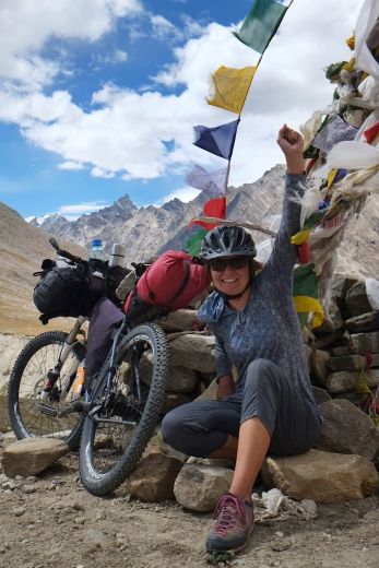 Kargil is the last supply point for the next three hundred kilometers. The small town is located in Kashmir, the region which is still claimed by Pakistan, and it is strongly influenced by muslims. A vibe like in Central Asia and as we find dates from Iran in the Bazaar, the Déjà Vue feeling gets even stronger. And the next few days through Suru valley we could as well be riding somewhere in Tajikistan. The same square mud houses, small mosques, the women with their colorful headscarves and wide bloomers, the men with small prayer caps on their heads. But then the ascent starts. First gently through a wide high valley, at the end in narrow switchbacks, we climb the 4300m high Penji La, the gateway to the ancient kingdom of Zanskar. A white stupa stands on the pass, colorful prayer flags are crackling in the strong wind, the sun is shining. We are back in the Tibetan world and are standing on a wild, high pass. A grin alone is now no longer sufficient. The echo throws back our cries of joy.