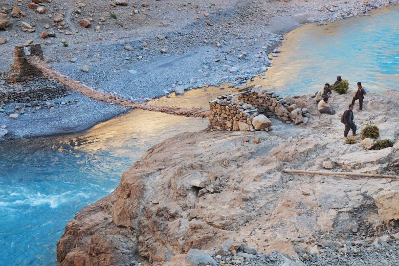 Padum, the capital of Zanskar valley is a big village. Cut off most of the year from the outside world, people look forward to the completion of the new road along the Zanskar river to Leh and the connecting road across the Shingo La pass to the Manali-Leh highway. "In five years the road work will be finished", says the lady from our guesthouse with conviction "then life will be much easier here." We doubt, because on our first visit four years ago the works were already in full swing, and already then we heard the "... in five years ..." But at least it is now possible to ride from the far side up to Shingo La and here the road has progressed for another forty kilometers into the valley. So we are fortunated to ride until Tsetang. But there the road ends in front of a massive cliff and leads only further as a narrow trekking path. We load our luggage on a horse and spend the next days pushing our bikes on exposed trails and carrying them over swaying suspension bridges and large boulders.