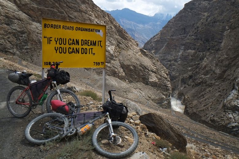 Like crumpled kraft paper are below us the dry mountains of Ladakh and Zanskar. Warm morning light licks the cold shadows of the valleys and projects bluish outlines on the snowfields and glaciers of the highest peaks. Slowly the plane lowers over the green oasis of the Indus valley, flies a final bend and lands. Exactly to this place we have dreamed ourselves in the last weeks in Canada. And now, after a long flight from Vancouver via Delhi, we are finally here. And something else is finally back. The tingling, the thrill, the passion of discovery - our wanderlust is back. We feel it in our mind, in the heart, in the belly. A broad grin, and then off on the bikes!